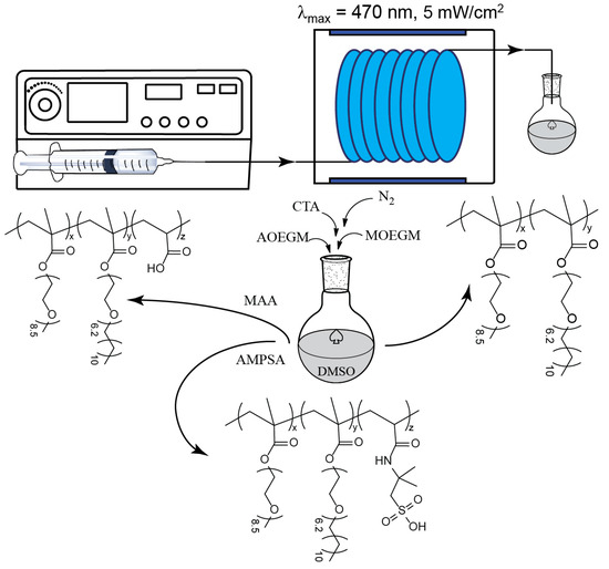 - Zaquen, N.; Kadir, A.M.N.B.P.H.A.; Iasa, A.; Corrigan, N.; Junkers, T.; Zetterlund, P.B.; Boyer, C. Rapid Oxygen Tolerant Aqueous RAFT Photopolymerization in Continuous Flow Reactors. Macromolecules 2019, 52, 1609–1619. [Google Scholar] [CrossRef]