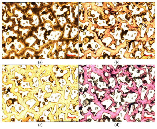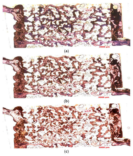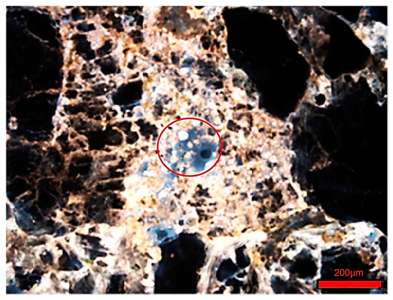 First, the glass-etched thin slices, saturated with kaolinite water suspension, were sampled using transmitted light microscopy. The image showing the effect after saturation with the kaolinite solution is shown in the figure. It can be observed that the kaolinite water suspension filled the throats and pores of the glass-etched model (see Figure 7).
