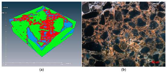 Inter-particle adsorption of residual oil in (a) CT 3D image and (b) fluorescence photograph.