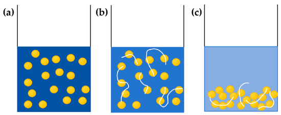 Flocculation diagram. (a) Kaolinite water suspension. (b) Formation of flocs. (c) Precipitation.