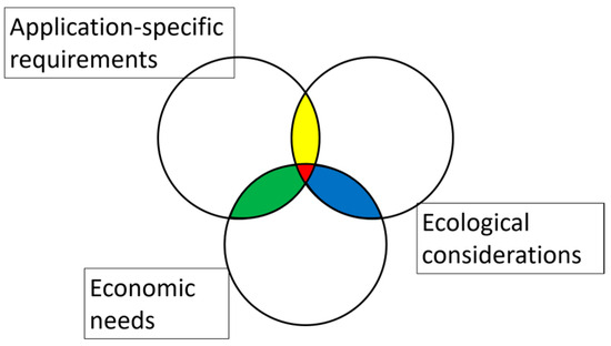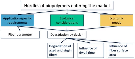 Screening the literature has revealed three essential perspectives that help to explain the challenges described above: application-specific requirements, ecological considerations, and economic needs [21]. Polymer fibers must meet certain requirements, including physical properties, for specific applications before they can be introduced to the market. Ecological considerations include the degradation-by-design approach, which deals with the tailoring of degradability based on the manufacturing process. Several facets of degradation by design are discussed here, based on the comparison of different home-compostable biopolymers produced on the same spinning equipment [22], including the influence of the fiber surface area [23] and the dwell time [19]. However, degradation by design must be tested for economic feasibility. This theoretical framework is depicted in Figure 1.