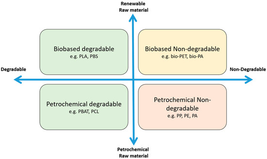 Overview of the four major groups of polymers [27,28,29]. Non-degradable petrochemical polymers are shown in the bottom right, and non-degradable biobased polymers are shown in the top right. Degradable petrochemical polymers are shown in the bottom left side, and degradable biopolymers are shown in the top left. PCL = polycaprolactone, PE = polyethylene. For other abbreviations, see the main text.