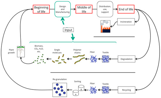 Composting, particularly of non-recyclable textiles contaminated with organic matter, is not considered in these methods and requires more research [77]. Factoring in the likelihood of improper disposal makes it necessary to consider degradation as a means to reduce the buildup of plastic waste. Additionally, the resulting compost can be used as a fertilizer at the beginning of the raw material production process for biobased polymers, thereby ensuring a supply of new raw materials. If recycling is impossible, particularly for textiles contaminated with organic material, incineration is currently the typical disposal route. But for textiles consigned to landfills or discarded in the environment, degradable biopolymers provide a beneficial end-of-life scenario. If this is already considered during product design, this alternative to incineration and recycling would reduce the accumulation of non-degradable landfill waste and also allow the disposal of products by home composting.