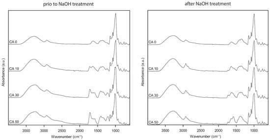ATR-FTIR spectra of potato peel-based films containing 10–50% CA prior to and after NaOH treatment are shown in Figure 2.