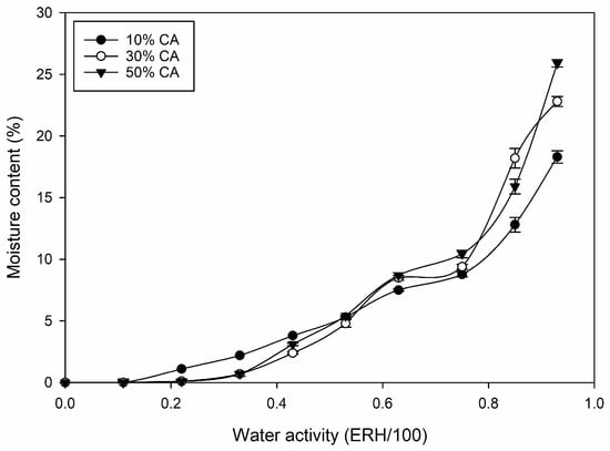 Moisture adsorption isotherms of potato peel-based films containing 10–50% CA showed sigmoidal shapes, which varied amongst different concentrations of CA (Figure 3). Up to a RH of 43%, all films were very brittle, with a moisture content of <4%. At 53% RH, all films had similar moisture contents of approximately 5%, but only films containing 50% CA were flexible (Section 3.3). Films containing 10% or 30% CA exhibited flexibility only at RH levels of ≥63%.