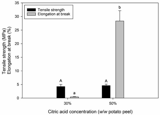 Tensile properties of potato peel-based cast films containing 30% or 50% (w/w potato peel) citric acid. The average thicknesses of the cast films containing 30% or 50% (w/w potato peel) citric acid were 131 ± 8 and 132 ± 9 µm, respectively. Different letters describe significant differences (p < 0.05) between measured values.