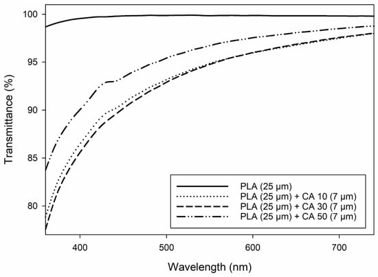 Coating of PLA sheets decreased light transmittance in the range of 360–740 nm, compared to neat PLA sheets (Figure 5). Overall, light transmittance decreased with decreasing wavelength, which was also previously reported for potato peel-based films plasticized with glycerol [].