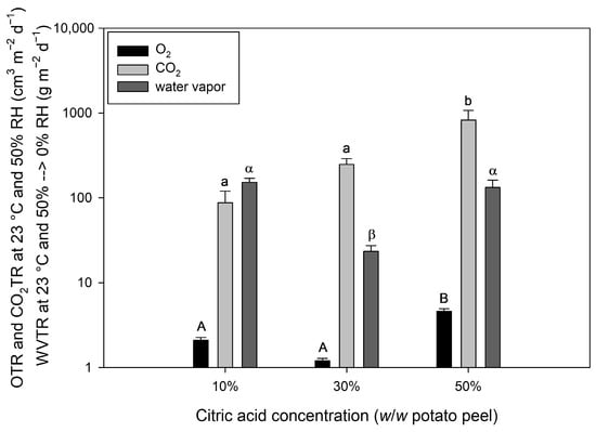 Oxygen- (OTR), carbon dioxide- (CO2TR), and water vapor transmission rate (WVTR) of potato peel-based coatings (7 ± 1 µm) as a function of citric acid concentration. Different letters describe significant differences (p < 0.05) between measured values.