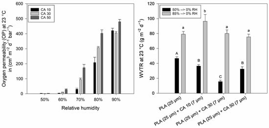 Oxygen permeability of potato peel-based coatings (7 ± 1 µm) containing 10–50% (w/w potato peel) citric acid (CA) as a function of relative humidity (left) and water vapor transmission rate (WVTR) of PLA and PLA–potato peel bi-layers containing 10–50% (w/w potato peel) CA (right). Different letters describe significant differences (p < 0.05) between measured values.