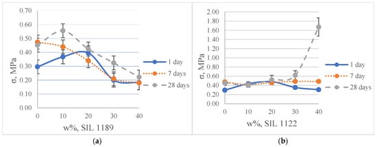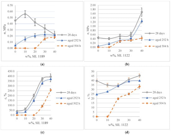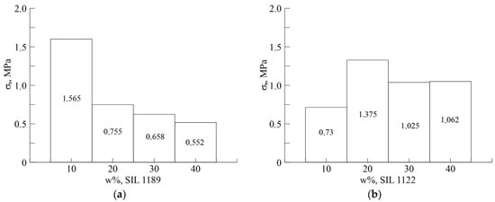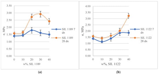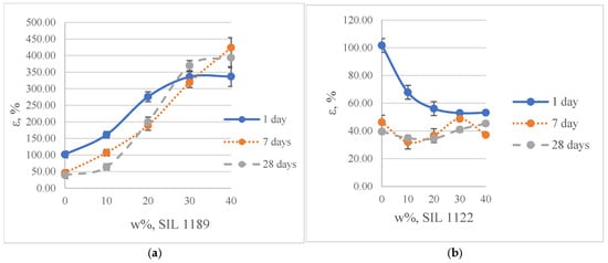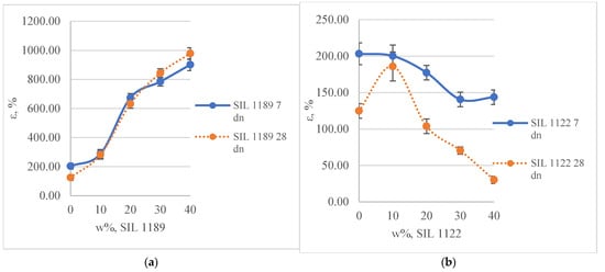- In the developed full adhesive system, the tensile strength properties increased both for systems without and with the prepolymers SIL 1189 and 1122. The compositions with the prepolymer SIL 1189 reached their maximum tensile strength at a 30% polymer concentration (2.92 MPa); at this concentration, they also had high deformation (843%). When the SIL 1122 prepolymer was added to the composition, the increase in adhesive tensile strength was higher (3.23 MPa at SIL 1122 40%) compared to SIL 1189, but at higher concentrations, a decrease in deformation (30.2% at SIL 1122 40%) was also observed, indicating that the prepolymer acted as a cross-linker of the system.