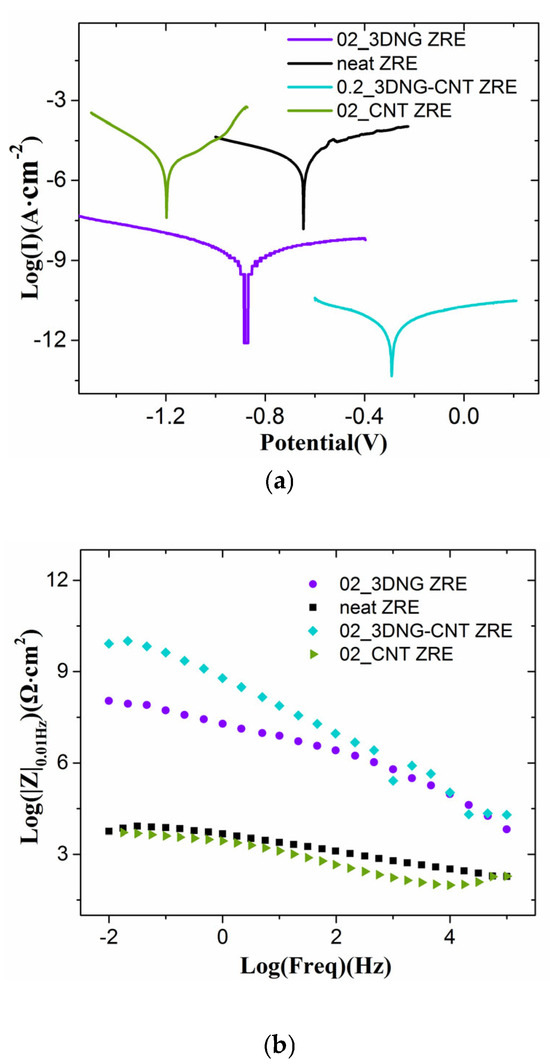 As the synergistic effect of fillers with different dimensions on various performance of the polymer composites had been demonstrated previously [22,23,24,25,26], one was expected to see whether such an effect contributes to the improvement of the corrosion resistance of ZRE coatings. ZRE coatings incorporated with the same content of a single carbon filler were fabricated, and their corrosion resistances were characterized. As shown in Figure 1 and Table 1, compared with that of 02_3DNG-CNT ZRE, both Tafel curves of 02_3DNG ZRE and 02_CNT ZRE moved upwards, and their Icorr values were evidently larger than that of 02_3DNG-CNT ZRE, especially for that of 02_CNT ZRE. The Icorr value of 02_CNT ZRE was even the same as that of neat ZRE, indicating the neglect contribution of CNTs to the cathodic protection of the ZRE coating. Such an effect of CNTs on ZRE was similar to the report by [27], where single-walled CNTs were utilized. Remarkably, it could be found that a reduction of more than six orders of magnitude in Icorr was realized, thanks to the utilization of hybrid fillers in the ZRE coating, as well as an increase of approximately eight orders of magnitude in RL, as shown in Table 1. The Bode plot shown in Figure 1b also indicates that the 02_3DNG-CNT ZRE had a much larger |Z|0.01Hz than both 02_3DNG ZRE and 02_CNT ZRE. All these results demonstrate the synergistic effect of 3DNG and CNTs on enhancing the corrosion protection of ZRE coatings.