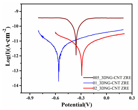 Based on the aforementioned results, the effects of different hybrid filler contents on the corrosion inhibition performance of ZRE coatings were studied. Interestingly, as shown in Figure 2, the Icorr of the coating was further reduced to 2.84 × 10−12 A·cm−2 when the content of the hybrid filler was reduced by half to 0.1 wt%, and its RL increased accordingly as well (Table 2), indicating its improved anti-corrosion performance at an even lower content of hybrid filler. However, with a further decrease of the hybrid filler content to 0.05 wt%, its Icorr was greatly increased to 1.08 × 10−10 A·cm−2, which was 38-fold that of 01_3DNG-CNT ZRE (Table 2). This meant that the effect of the hybrid filler on improving the anti-corrosion performance of 3DNG-CNT ZRE depended on its content, and the optimal content of the hybrid filler in this work was 0.1 wt%, which was comprised of only 0.025 wt% 3DNG and 0.075 wt% CNT.