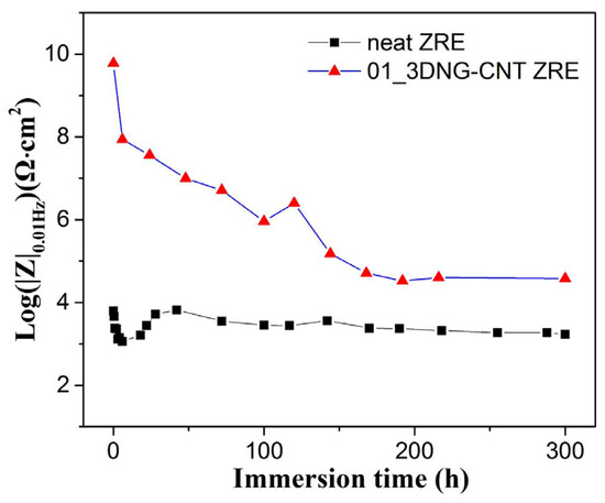 The dependence of |Z|0.01Hz of neat ZRE and 01_3DNG-CNT ZRE coatings on the immersion time.