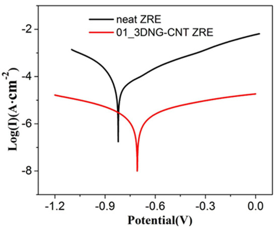 Tafel curves of neat ZRE and 01_3DNG-CNT ZRE coatings after 300 h immersion in 3.5 wt% NaCl solution.