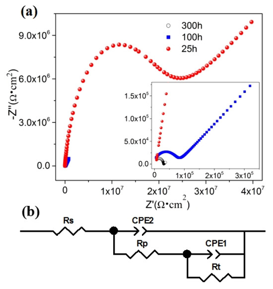 (a) Nyquist plots of 01_3DNG-CNT ZRE coating on Q235 sample immersed in NaCl solution at 25 h, 100 h and 300 h and (b) schematic diagrams of equivalent analog circuits for EIS analysis of the hybrid nanocarbon-modified ZRE.