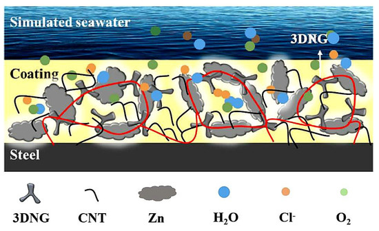 Figure 8 illustrates the anti-corrosion mechanism of ZRE coatings modified with hybrid nanocarbon fillers. The incorporation of 3DNG into the ZRE coating helps to form electro-conductive paths between Zn particles and the steel substrate, as more conduction paths formed between the Zn particles and the steel substrate are conducive to activating more zinc particles to exert their cathodic protection function through the sacrificial-anode electrochemical corrosion reaction. In addition to this, the excellent impermeability of 3DNG to the corrosives also benefits the barrier property of its ZRE coating. However, taking into account the large size of 3DNG (micron scale), there are still some minor spaces to be filled to build a more effective conductive network. With further incorporation of CNTs, micropores in the coating can be eliminated more or less with the nanofillers, therefore hindering the corrosive invasion through the coating. Moreover, due to the electrical connection provided by the 1D CNTs, more Zn particles will be linked into the conductive network made of 3DNG, CNT, Zn particles and the steel substrate for exerting their cathodic protection function (see the red line in Figure 8), thereby maximizing the sacrificial-anode roles of zinc in the entire coating system.