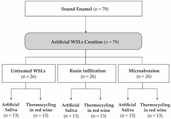 The study design is summarized in Figure 1. The baseline color and surface roughness (Ra) of all sound enamel samples were recorded. To create artificial WSLs, the samples were immersed in a demineralization solution. A total of 78 WSLs were created and equally divided into three groups: untreated WSLs, resin infiltration (RIT), and microabrasion (MA). The samples were kept at room temperature, dried, and shielded from direct sunlight. Each group was further subdivided into two subgroups: one immersed in artificial saliva as a control, and the other subjected to thermocycling in red wine. The color and Ra were measured at each experimental stage, as described below.
