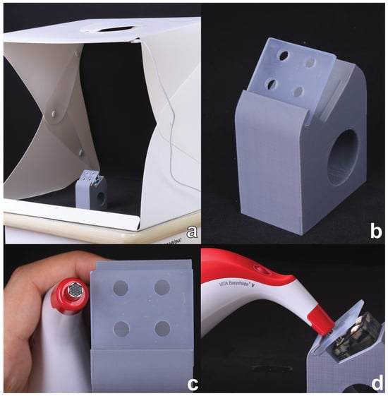 A 3D-printed resin model and color measurement protocols. (a) Viewing box with a D65 illuminant. (b) A 3D-printed model. (c) The template was designed to be the same size as the tip of the VITA Easyshade® V. (d) The 45°/0° standard measurement was controlled by the 3D-printed model.