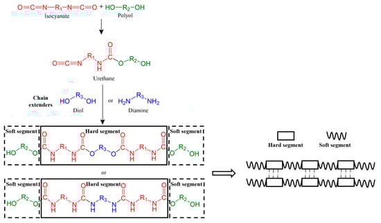 The chemical reaction of PU synthesis and representation of soft segment and hard segment.