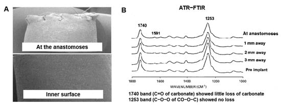 (A) ESEM pictures of Myolink™ graft post-implant, (B) the ATR-FTIR result of Myolink™ graft, pre-implantation (control) at distal anastomoses and 1, 2, and 3 mm away from anastomoses post-implantation [87]. Copyright 2003, Elsevier Ltd.