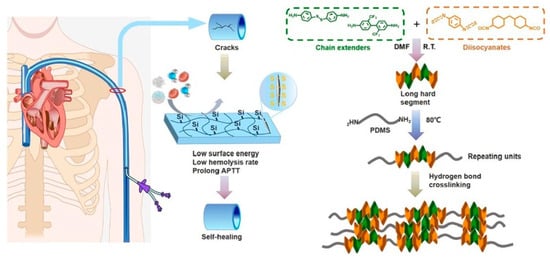 Polydimethylsiloxane (PDMS) and macromolecular fluorocarbons have low surface energy; modification of PU ends with these compounds can increase its biological stability, and enrichment on the PU surface can hinder material degradation [94,95]. Nguyen et al. [91] studied the surface characteristics of end-modified PU materials Biospan and CarboSil, confirming that these two materials had good blood compatibility and could be used in cardiovascular devices. Kim et al. [96] treated PDMS-modified PU in lipase and 30% H2O2 for 8 weeks, and the change of mass was tested to evaluate the degradation, with no obvious weight change showing good biological stability. However, the softness of the high content of PDMS in bone chains and weak intermolecular forces will affect the mechanical properties of PU [97]. Tang et al. [98] used PDMS end-group-modified PTMEG as a polyol, MDI as a hard segment, and fluorodiol (FDO) and BDO as a chain extender to synthesize silicon-containing fluorinated polyurethane with low PDMS content. After 6 months of the implant in mice, there was no obvious degradation on the surface of the material, and the soft segment chain crack was small. Yan et al. [99] used fluorinated 2,2′-bis (trifluoromethyl) benzidine (TFMB) and 4-aminophenyl disulfide (APS) as chain extenders to improve the hydrophobicity and self-healing properties of the hard segment and used diisothiocyanate (PDITC) and HMDI as mixed diisocyanate. The long hard segment has a highly stable hydrogen bond, and PDMS is a soft segment, so the obtained long hard segment polyurethane has the characteristics of self-healing in the blood (Figure 5).