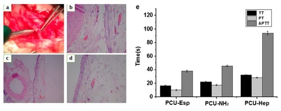 The mixed PU can be used to improve the mechanical properties of blood vessels. Rohringer et al. [169] prepared TPU using poly(tetrahydrofuran), HMDI, and Bis(2-hydroxyethyl) terephthalate (BHET). Poly(tetrahydrofuran), HMDI, BHET, and di(tert-butyl)ethylenediamine can be used to prepare a new type of self-strengthening polyurethane urea (TPUU), and the PU artificial blood vessels can be formed by using the co-mixed two materials. The biomechanical properties are sufficient even if the walls of artificial blood vessels become thin, and there was no inflammation, aneurysm, intimal hyperplasia, or thrombosis observed (Figure 11).