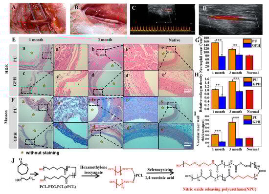 (A) and (B) The images of the carotid artery sites of rabbits before and after PU blood vessel implantation, (C) and (D) the ultrasound images of PU blood vessels after implantation for 3 months, (E) and (F) the H and E and Masson staining of different groups of PU blood vessels, respectively, (G) the neutrophil count of different groups of PU blood vessels, (H) the collagen density of different groups of blood vessels, (I) the vascular inner wall thickness of different groups of blood vessels, (J) the synthesis method of PU material with NO release function used for the blood vessels. The data are shown as the means ± S.D. from three independent experiments. ** p < 0.01, *** p < 0.001 indicates significant differences between the indicated columns [145]. Copyright 2024, Elsevier Ltd.