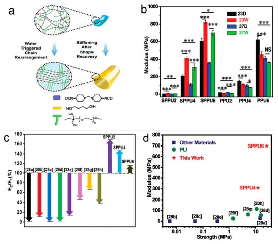(a)Water-triggered stiffening of shape-memory polyurethane in the shape-recovery process, (b) the modulus of different PU at 23 and 37 °C, both in dry and hydrated conditions, (c) the modulus change, and (d) Young’s modulus and tensile strength of PU in this study compared to the previously reported thermally and water-triggered shape-memory materials. Results are presented as mean ± standard deviation, n ≥ 3. * p < 0.05, ** p < 0.01, *** p < 0.001, NS means not significance [166]. Copyright 2022, Wiley Ltd.