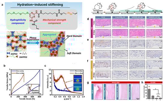 (a) The design of the PU elastomers, (b) the stress-strain and (c) small-angle X-ray scattering curves of DAPPEG3k/DAPEG_1/1 in wet and dry conditions, (d) the hematoxylin and eosin (H and E), (e) D68, and (f) CD3 images of different samples at day 7 and day 14 after implantation, (g) the alizarin red staining of calcium depositions, (h) quantitative statistics of the calcium contents detected by ICP-OES. The data were presented as mean ± SD with n = 4. * p < 0.05, n.s. means not significant, the dull red pentacle Indicates that this group was significantly higher or lower than any other groups [168]. Copyright 2024, Elsevier Ltd.