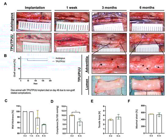 (A) The newly formed media layer of TPU/TPUU grafts after being implanted for 6 months in vivo, (B) the patency of TPU/TPUU grafts, (C) the wall thickness of TPU/TPUU grafts after 6 months of implantation, (D) the compliance of TPU/TPUU grafts after 6 months, (E,F) the tensile force and maximal applied strain values after 6 months of implantation. The results are presented as mean ± standard deviation, n = 3. Statistical analysis: t-test, *: p ≤ 0.05, mean ± SD. [169]. Copyright 2023, Wiley Ltd.