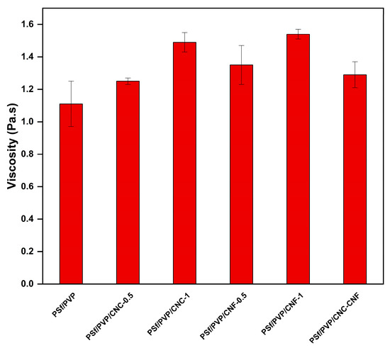 In the production of flat sheet membranes via the non-solvent-induced phase inversion method, the viscosity of the membrane casting solution significantly affects the exchange rate between solvent and non-solvent [60]. The viscosity of the membrane casting solution varies depending on the amount of polymer, properties of the polymer, type of solvent, amount of PVP, properties of PVP, and temperature of the casting solution [49,61,62,63,64,65]. Figure 3 shows the viscosity values of the casting solutions at 22 °C prepared to produce PSf/PVP-based membranes. The casting solution of the PSf/PVP membrane had the lowest viscosity value of 1.11 ± 0.14 Pa.s. With the inclusion of CNC and CNF in the PSf/PVP/DMF solution, the viscosity of the solution increased, and the viscosity of the casting solutions prepared for nanocomposite membrane production varied between 1.25 ± 0.02 and 1.54 ± 0.03 Pa.s. When the amount of CNC and CNF in the membrane casting solution increased from 0.5 to 1 wt%, the viscosity of the membrane increased further due to the casting solutions containing more solids. CNF-doped casting solutions had a higher viscosity than CNC-doped casting solutions at the same concentration. Similarly, it has been reported that CNC has a lower viscosity than CNF in suspensions at the same concentration [66].