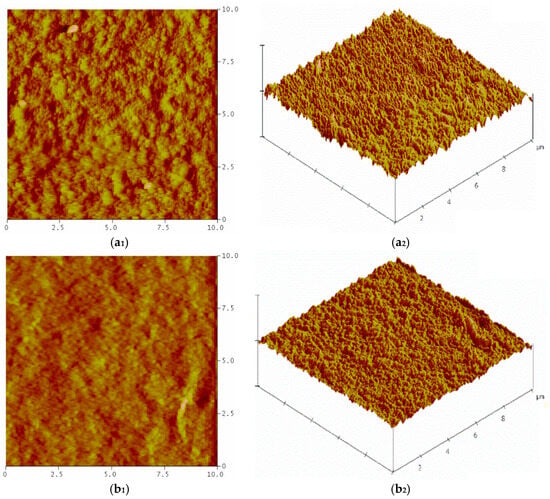 The surfaces of the produced membranes were further characterised by AFM analysis, and the roughness parameters of the membranes were determined. Figure 5 shows 2D and 3D AFM images of the membranes, and Table 2 shows the roughness parameters of the membranes. AFM images of all membranes showed that the membranes had a “peak-and-valley” structure. In the AFM images, the bright and dark regions are indicative of the peaks and valleys, respectively, on the surface of the membranes. The PSf/PVP membrane had the roughest surface, and the surface roughness of the membrane decreased with the addition of CNC, CNF, and CNC-CNF into the PSf/PVP membrane. Similarly, the roughness of the PES membrane decreased with the addition of CNC functionalised with amino acid cysteine to the membrane [70].