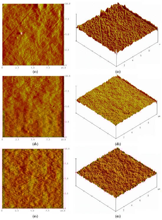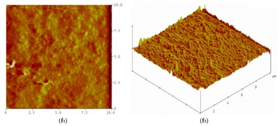(1) Two-dimensional and (2) three-dimensional AFM images of PSf/PVP-based membranes: (a1,a2) PSf/PVP, (b1,b2) PSf/PVP/CNC-0.5, (c1,c2) PSf/PVP/CNC-1, (d1,d2) PSf/PVP/CNF-0.5, (e1,e2) PSf/PVP/CNF-1, and (f1,f2) PSf/PVP/CNC-CNF.