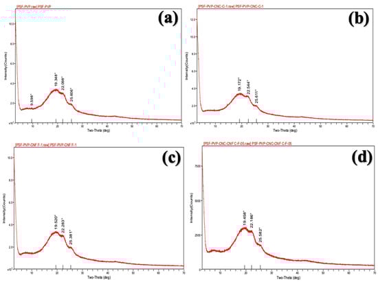 XRD patterns of PSf/PVP-based membranes: (a) PSf/PVP, (b) PSf/PVP/CNC-1, (c) PSf/PVP/CNF-1, and (d) PSf/PVP/CNC-CNF.
