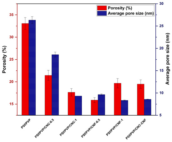 Porosity and pore size play an important role in the water flux and separation efficiency of membranes [79]. Figure 7 shows the porosity and average pore size of the membranes. PSf/PVP membrane had the highest porosity (33.08 ± 1.32%), and the porosity of the membrane decreased with nanocellulose reinforcement. The porosity of nanocellulose-reinforced nanocomposite membranes varied between 15.90 ± 0.56 and 21.45 ± 1.12%. Consistent with the SEM images, the membrane with the highest surface porosity was PSf/PVP. High porosity in membranes is a property that offers both advantages and disadvantages. The increased porosity of the membrane facilitates the passage of water and thus contributes to the high water flux observed during the filtration process. Furthermore, the filtration of water through high porosity membranes is facilitated, thus enabling high water flux at lower pressures [80]. Therefore, high porosity enables an energy-efficient filtration process. Conversely, high porosity can reduce the separation efficiency of the membrane as it increases the potential for contaminants in the water to more easily pass through the membrane. Furthermore, high porosity causes a reduction in the mechanical strength of the membrane, as the structural integrity of membranes with high porosity is less than that of membranes with lower porosity.
