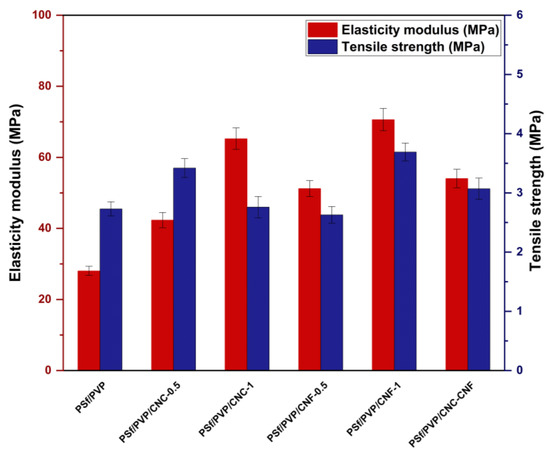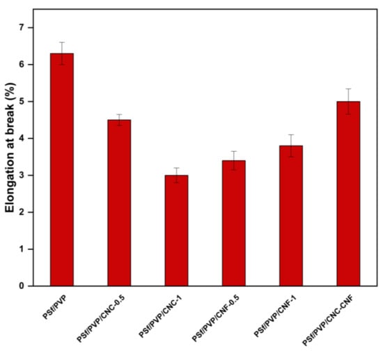 The elasticity modulus of the membranes was calculated by the ratio of stress to strain in the region where the membranes exhibit elastic behaviour in the stress–strain curve. Figure 9 shows the elasticity modulus and tensile strength of PSf/PVP-based membranes. The PSf/PVP membrane had the lowest elasticity modulus with 28.06 ± 1.3 MPa, while the elasticity modulus of the membrane increased with CNC, CNF, and CNC-CNF reinforcement. This can be attributed to the fact that the elasticity modulus of CNC and CNF is higher than the elasticity modulus of the membrane matrix materials [31,78]. As the amount of CNC and CNF incorporated into the PSf/PVP membrane was increased from 0.5 to 1 wt%, the membrane exhibited enhanced elasticity modulus. CNF performed better than CNC in increasing the rigidity of the polymer-based membrane. The addition of 0.5 wt% and 1 wt% CNC to the PSf/PVP membrane increased the elasticity modulus of the membrane by approximately 51% and 133%, respectively, while the addition of 0.5 wt% and 1 wt% CNF increased it by 83% and 152%, respectively. Among the membranes produced, the PSf/PVP/CNF-1 membrane had the highest elasticity modulus (70.63 ± 3.15 MPa) and the highest tensile strength (3.69 ± 0.15 MPa). This showed that the PSf/PVP/CNF-1 membrane was the most rigid and could withstand more stress. Figure 10 shows the elongation at break values of membranes. The elongation at break of the PSf/PVP membrane (6.3 ± 0.3%) decreased with CNC, CNF, and CNC-CNF reinforcement of the membrane. This indicated that nanocellulose-reinforced nanocomposite PSf/PVP-based membranes were less flexible and less deformable than PSf/PVP membranes. Similarly, in a study by Lalia et al. (2014), when 2 wt% nanocrystalline cellulose was added to polyvinylidene fluoride-co-hexafluoropropylene (PVDF-HFP) membrane, the tensile strength of the membrane increased from 12.6 to 17.2 MPa, while the modulus of elasticity of the membrane increased from 72 MPa to 105 MPa. On the other hand, in the study, 2 wt% nanocrystalline cellulose added to the PVDF-HFP membrane decreased the elongation at break of the membrane from 25 mm to 23 mm [81].