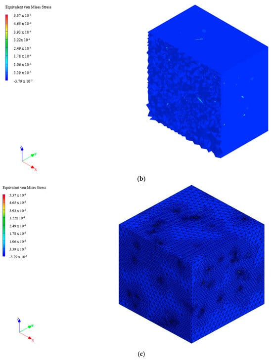 In the finite element model, nanocellulose-reinforced, isotropic cubic representative volume elements (RVEs) were generated in Digimat FE. The RVEs were divided into tetrahedral elements. In the finite element method, the values for the matrix and nanocellulose reinforcements were the same as those used in the Mori–Tanaka mean-field homogenisation method.