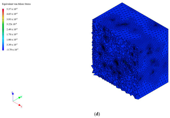 Equivalent von Mises stress distribution in RVE of PSf/PVP/CNC-CNF membrane: (a) whole RVE, (b) cross-section of the RVE, (c) whole RVE with mesh structure, and (d) cross-section of the RVE with mesh structure.
