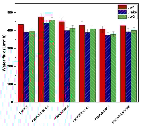 The water flux performance of membranes is a critical parameter that affects the efficiency of the filtration process, energy efficiency, and the size of equipment required for filtration [82,83]. Membranes with higher water flux performance allow more water to be filtered in less time [53]. Membranes with high water flux performance require less energy consumption for water filtration, reducing the process’s operating cost [84]. A filtration process using membranes with high water flux performance requires less membrane surface area than a filtration process using membranes with lower flux performance, reducing both the cost of equipment (membranes and equipment) and the space occupied by the membrane system [85]. Figure 12 shows the water fluxes of PSf/PVP-based membranes. While the flux of PSf/PVP membrane for distilled water was 433.92 ± 18.69 L/m2.h at 3 bar, the water flux performance of the membrane increased by 9.58% and 3.60% with a 0.5% CNC and 1% CNC reinforcement in the membrane, respectively. Bai et al. (2017) also reported that while the pure water flux of a polyethersulfone (PES) membrane at 0.5 MPa was 1240 L/m2.h, the pure water flux of the membrane increased to 3524 L/m2.h with 2 wt% CNC reinforcement at the same pressure. In another study, 0.5 wt.% CNC reinforcement yielded a pure water flux increase from 2.5 to 10.6 L/m2.h and from 0 to 2.6 L/m2.h for membranes based on 20 wt.% PSf and 30 wt.% PSf produced using the immersion precipitation technique, respectively [86]. On the other hand, the flux of the membrane for distilled water decreased by 1.32% and 6.30%, respectively, with 0.5% and 1% CNF by weight reinforcement of the PSf/PVP membrane. The fact that the 0.5 wt% CNC-reinforced membrane exhibited the highest distilled water flux performance (475.50 ± 17.77 L/m2.h) among all membranes can be attributed to (1) the high surface porosity of the membrane (Figure 4b), (2) the agglomerate-free surface of the membrane (Figure 4b), and (3) the presence of hydrophilic CNCs on the membrane surface that facilitate the passage of water through the membrane. The flux performance of the membranes decreased due to the lower surface porosity and smaller pore sizes of highly CNC-, CNF-, and CNC-CNF-reinforced membranes. In these membranes, the agglomerates of nanocellulose blocked the pores on the surface, which may have prevented the water from filtering more uniformly through the membrane under pressure and may have caused the flux reduction.