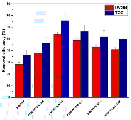 During the disinfection process in drinking water treatment, organic matter in the water interacts with disinfectants such as chlorine and causes the formation of disinfection by-products that pose a threat to human health [87]; therefore, it is necessary to effectively remove organic matter from water. Figure 13 shows the UV254 and TOC removal efficiency of PSf/PVP-based membranes from lake water. The UV254 and TOC values of lake water were 0.148 cm−1 and 6.12 mg/L, respectively. The UV254 and TOC removal efficiency of PSf/PVP membrane from lake water was low with 28.30 ± 1.58% and 36.35 ± 4.20% efficiency, respectively. The UV254 and TOC removal efficiencies of the nanocomposite membranes varied in the ranges of 37.55 ± 1.98%–53.87 ± 2.15% and 46.22 ± 5.20%–65.56 ± 6.44%. The decrease in porosity and pore size of nanocellulose-reinforced membranes compared to PSf/PVP membranes contributed to the increase in organic matter removal efficiency from water. Among the nanocellulose-reinforced nanocomposite membranes, the PSf/PVP/CNC-1 membrane exhibited the highest UV254 and TOC removal efficiency with 53.87 ± 2.15% and 65.56 ± 6.44%, respectively. The results revealed that CNC, CNF, and CNC-CNF reinforcement contributed to improving the UV254 and TOC removal performance of the membrane by modifying the physical properties. Currently, there are no studies on the removal of TOC and UV254 from lake water using nanocellulose-reinforced polymer-based membranes. Some studies have reported that BSA [36,88], iron [89], chromium [89], and turbidity [89] removal increased by modifying polymer-based membranes with nanocellulose.