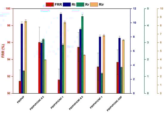 To investigate the antifouling performance of the membranes, the total fouling ratio (Rt), reversible fouling ratio (Rr), irreversible fouling ratio (Rir), and flux recovery ratio (FRR) of the membranes were calculated using Equations (4)–(7) [53].
