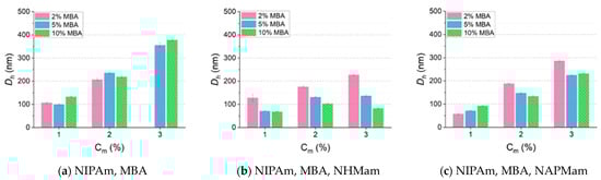 The impact of changing the Cm to tailor Dh was initially evaluated for neutral microgels prepared in water with NIPAm and varying crosslinking (MBA) degrees (2, 5, and 10 molar%). The results shown in Figure 2a (correlograms in Figure S3) provide evidence of the key role played by Cm in determining the Dh for all formulations. The Dh of microgels prepared with 2 molar% MBA and Cm equal to 1 or 2 wt% was 108 and 208 nm, respectively, resulting in an increase of 1.9-fold in Dh. A similar trend was observed for microgels prepared with 5 and 10 molar% of MBA, where the Dh of microgels increased by 3.5- and 2.8-fold, respectively. With the formulation prepared with 2 molar% MBA at Cm 3 wt%, the Dh could not be obtained reliably, as the formulation was not monodispersed nor colloidally stable. These results are consistent with literature data [52] and can be explained by the more frequent collisions, resulting from higher Cm, during the polymerisation.