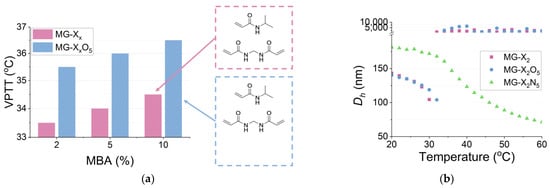 The thermoresponsive properties of microgels, dispersed in deionised water at 1 mg mL−1, were evaluated using UV–vis spectrophotometry. The data highlight the impact of the different formulations on VPTT values (Figure 3a). The crosslinking degree played a crucial role in the VPTT for neutral and hydrogen-bonding microgels, where the increase in rigidity resulted in higher VPTT values (Figure S6). Adding hydrogen-bonding groups led to an increase of 2 °C to the VPTT of microgels, resulting in a range (35.5–36.5 °C) that is more relevant, for example, to biomedical applications. The increase in hydrophilicity resulting from the addition of NHMAm restrains the desolvation of water molecules, hindering the structural change involved in the thermoresponsive property of NIPAm [61]. The thermoresponsive behaviour was also evaluated using DLS in the temperature range of 20–60 °C, and the data (Figure 3b) show aggregation for both MG-Xx and MG-XxO5 at temperatures above 32 and 34 °C, respectively.