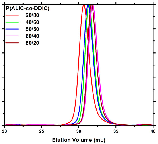 SEC chromatograms of all the P(ALIC–co–DDIC) samples.