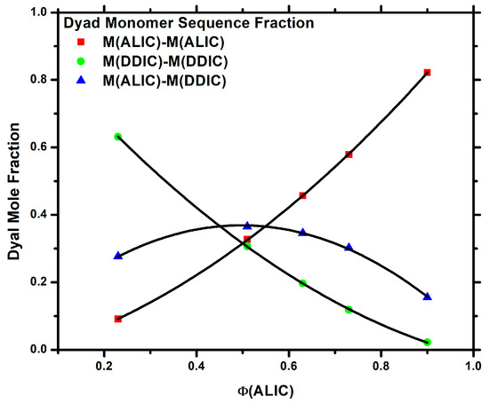 The reactivity ratios were calculated taking into account the terminal model, according to which the propagation reaction was exclusively determined by the chemical nature of the monomer, which was the terminal unit of the developing polymer chain [72]. The different methodologies yielded comparable results, as evidenced in Table 3. The plots of the respective methodologies, shown in Figures S3–S6 and Table S1 of the SIS, demonstrate a high degree of linearity, confirming the validity of the terminal model. In each instance, the reactivity ratios of both ALIC and DDIC exceeded unity, with the reactivity ratio of ALIC being notably higher than that of DDIC. The same conclusion was reached by the COPOINT program. This suggests that both monomers in this copolymerization reaction tend to homopolymerize, ultimately forming multiblock copolymers with longer PALIC sequences. This conclusion is also verified by the statistical distribution of the dyad monomer sequences MALIC-MALIC, MALIC-MDDIC, and MDDIC-MDDIC, which was determined using the Igarashi equations [73]. More details related to the calculation method are available in the SIS. Along with the dyad monomer sequences, the mean sequence lengths μALIC and μDDIC were calculated [74], and the results are summarized in Table S2 of the SIS, whereas the variation in the dyad fractions with the ALIC mol fraction in the copolymers is displayed in Figure 4. All the data support the increased tendency of ALIC to homopolymerize compared to DDIC, as well as the formation of multiblock copolymers.