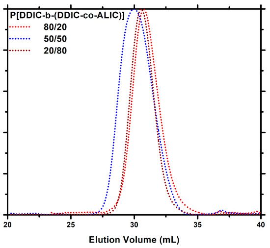 SEC traces of the P[DDIC-b-(DDIC-co-ALIC)] block copolymers.