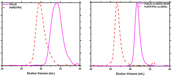 The synthetic procedure was also monitored by SEC. All the samples possessed remarkably narrow and monomodal distributions, as evidenced by the SEC traces depicted in Figure 5, proving the successful incorporation of the second monomer into the developing chain as well as the effective control of the reaction.