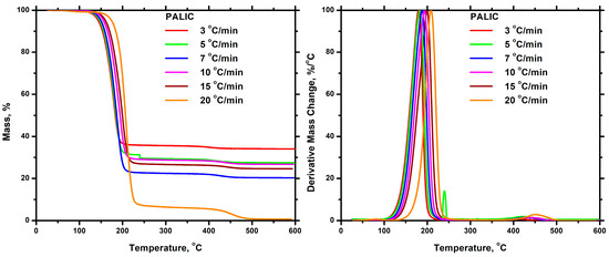 TGA (left) and DTG (right) plots for the PALIC at all heating rates.