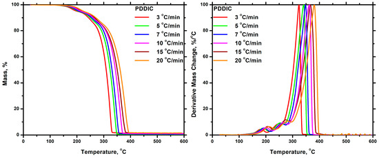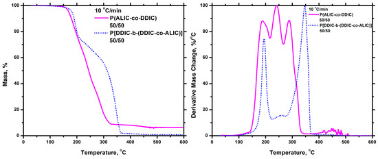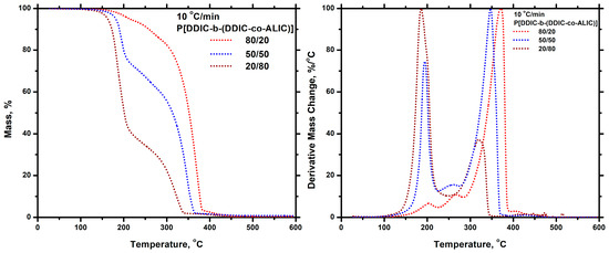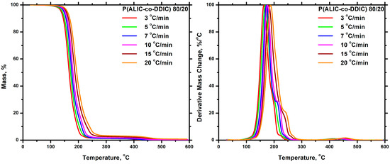 The thermal degradation of each homopolymer was investigated using TGA and DTG techniques. The measurements were performed at various heating rates (3, 5, 7, 10, 15, and 20 °C/min). The thermograms obtained from TGA and DTG for the homopolymers are presented in Figure 11 and Figure 12. A comparison of the DTG diagrams revealed that PDDIC exhibited greater thermal stability than PALIC. The thermal degradation of PALIC started at a lower temperature than that of PDDIC, and the peak corresponding to the maximum degradation rate occurred at significantly lower temperatures as well. The complete thermal degradation of PDDIC took place in a temperature range of 200 to 250 °C, higher than that of PALIC. Moreover, PALIC exhibited a single, relatively symmetric degradation peak in DTG, whereas PDDIC displayed two additional but minor peaks. This indicates that the degradation mechanism is relatively simple for PALIC, whereas in the case of PDDIC, it is more complex, involving additional degradation steps. However, the highest proportion of PDDIC was degraded during the third stage at elevated temperatures. The increased thermal stability of PDDIC can be attributed to its semi-crystalline nature and, therefore, the strong intermolecular interactions developed between the polymer chains. In each case, it is evident that the temperature values corresponding to the initiation and completion of thermal degradation, as well as the temperature at the maximum rate of degradation, increased upon the application of a higher heating rate. The thermal degradation process is a kinetic phenomenon, which explains the slower response of the system to the temperature change as the heating rate increased. A characteristic finding of the thermal decomposition of PALIC was the appearance of a high amount of residue. It seems that the presence of the side allyl moieties of PALIC led to extended carbonization phenomena.