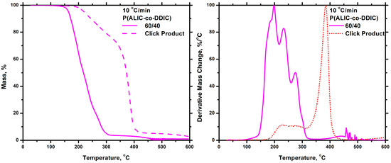 PICs are thermally sensitive polymers, since their thermal decomposition takes place at relatively low temperature values [75,76,77]. The thermal stability of PICs could be increased by the introduction of side-groups that may retard the thermal degradation. These side groups could be introduced either using specific IC monomers that could be homopolymerized or copolymerized with other more conventional monomers or by performing suitable post-polymerization reaction to preformed PICs. The presence of the allyl side group of the ALIC monomer units offers this possibility. The prerequisite for this procedure is that the functionalization reaction should take place under mild conditions to avoid the thermal decomposition of the parent material or any type of unwanted side reaction, such as crosslinking. In this work, the radical-mediated thiol-ene click reaction was employed [78]. This methodology has previously been applied to PALIC chains to introduce polar hydroxyl groups along the polyisocyanate backbone [63], showing that this procedure is efficient and can be adopted without side effects on the parent chain.